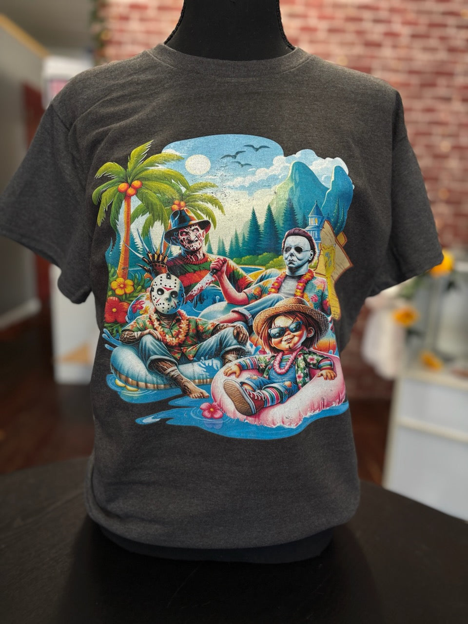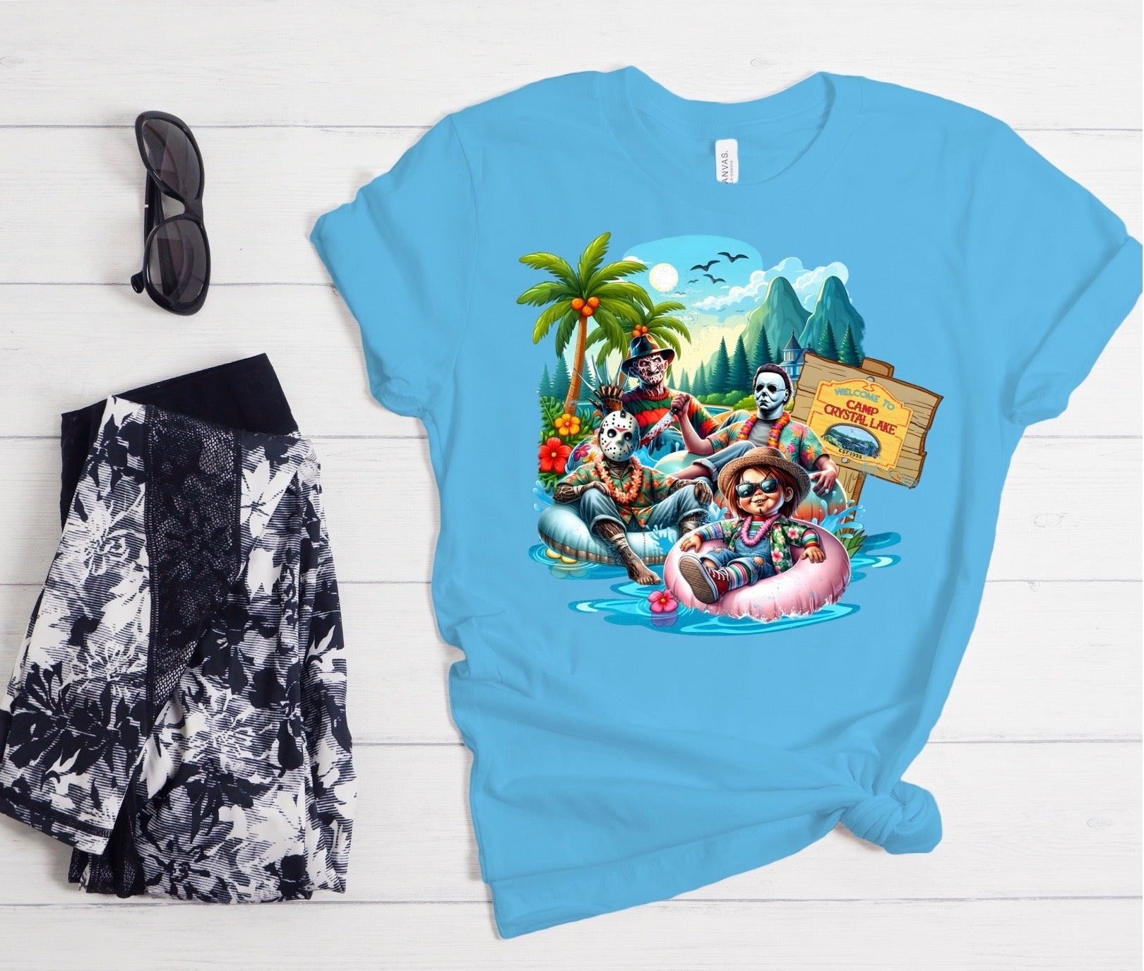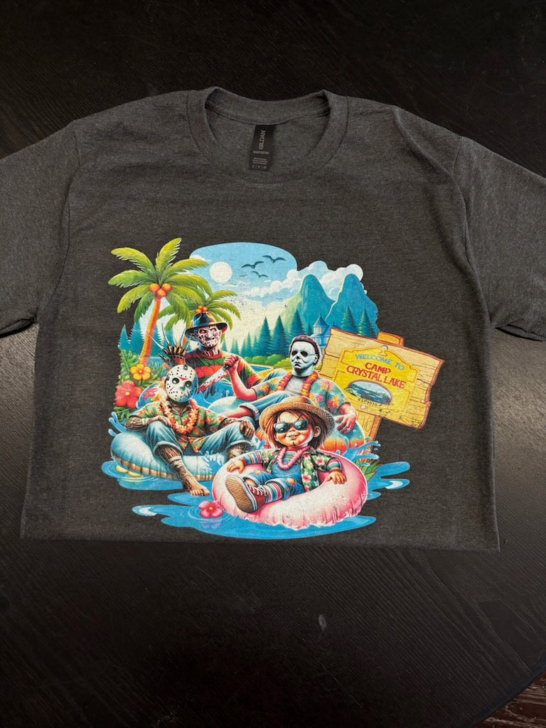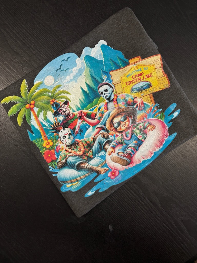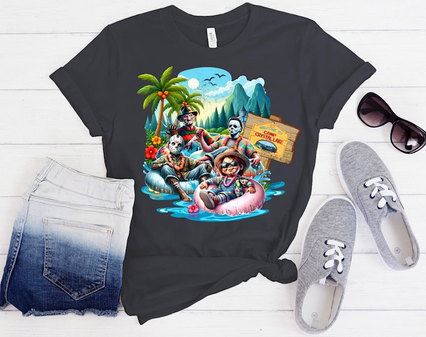 Dive into frightful fun with our Horror Icons Pool Party T-Shirt! This wickedly awesome tee features Freddy Krueger, Jason Voorhees, Michael Myers, and Chucky living it up at a killer pool party. Picture Freddy rocking a striped floatie, Jason chilling with a hockey mask-shaped beach ball, Michael looming with a menacing cocktail, and Chucky causing mischief by the diving board—all set against a vibrant, retro-inspired poolside scene.